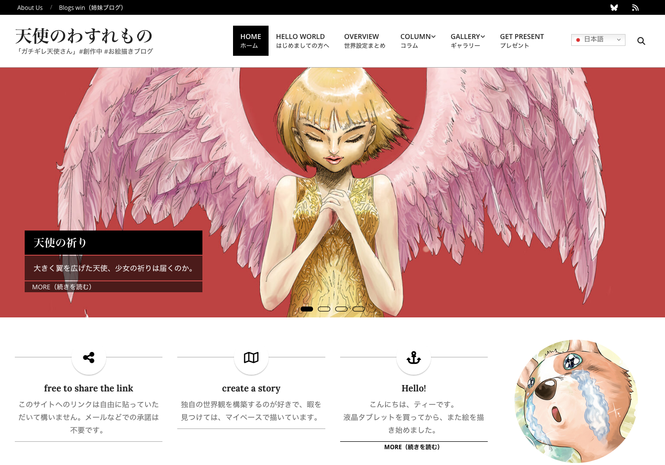 angel.winproject.jp リニューアルしました! 今までのは絵日記ブログっぽい感じだったので。 使用しているWordpressテーマなど、テクニカルな内容については Blogs win へ書いています。